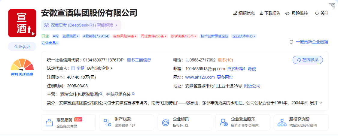 据了解,安徽宣酒集团位于安徽省宣城市境内,2004年改制为股份制企业。宣酒园区占地1300余亩,是国家4A级景区,拥有7600多条固态发酵小窖池,进入中国白酒工业50强。