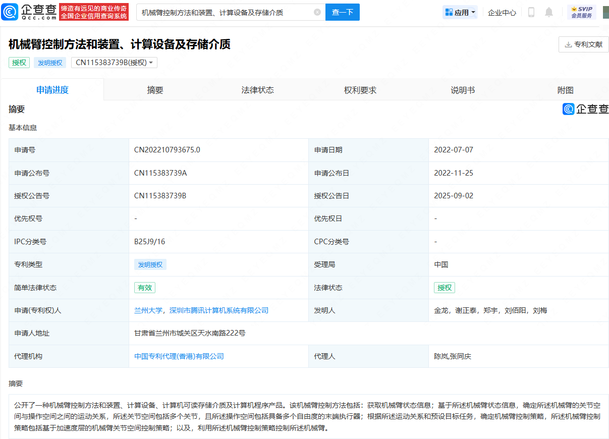 近日,深圳市腾讯计算机系统有限公司“机械臂控制方法和装置、计算设备及存储介质”专利获授权。本专利公开了一种机械臂控制方法和装置、计算设备、计算机可读存储介质及计算机程序产品。该机械臂控制方法包括:获取机械臂状态信息;基于所述机械臂状态信息,确定所述机械臂的关节空间与操作空间之间的运动关系,所述关节空间包括多个关节速速查,且所述操作空间包括具备多个自由度的末端执行器;根据所述运动关系和预设目标任务,确定机械臂控制策略,所述机械臂控制策略包括基于加速度层的机械臂关节空间控制策略;以及,利用所述机械臂控制策略控制所述机械臂。