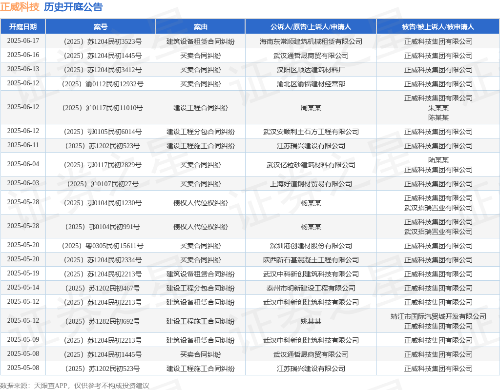 案号:(2025)苏1204民初3523号审理法院:泰州市姜堰区人民法院案由:建筑设备租赁合同纠纷当事人信息: 原告/上诉人:海南东常顺建筑机械租赁有限公司 被告/被上诉人:正威科技集团有限公司开庭日期:2025年6月17日根据统计,近一年内以正威科技集团有限公司为当事人的历史开庭公告有134则,其中案由为“买卖合同纠纷”的公告以39则居首,其次为“建设工程施工合同纠纷”有23则,“建设工程分包合同纠纷”有14则。历史开庭公告(前20条)如下: