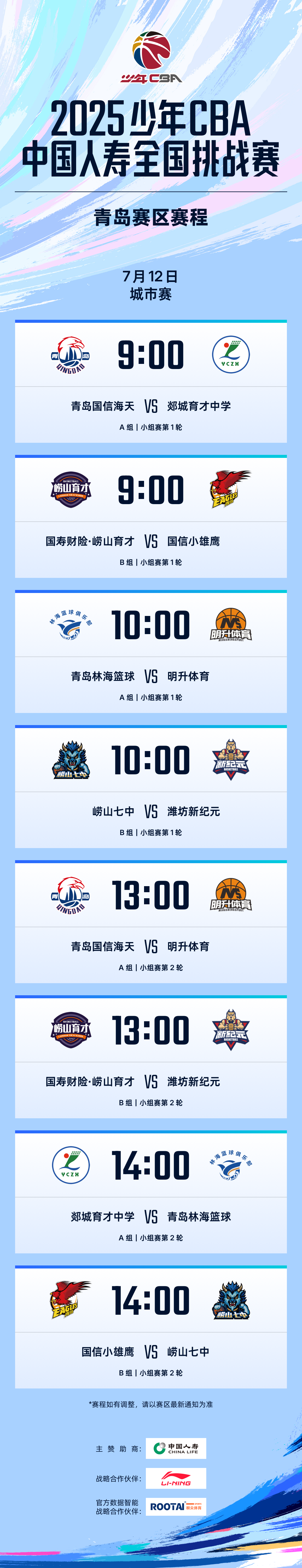 7月12日-14日,他们将在青岛国信体育馆展开激烈角逐,冠军队伍将代表青岛参加2025年少年CBA·中国人寿全国挑战赛全国总决赛!