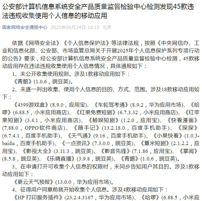 据微信号“国家网络安全通报中心”24日消息,依据《网络安全法》《个人信息保护法》等法律法规,按照《中央网信办、工业和信息化部、公安部、市场监管总局关于开展2025年个人信息保护系列专项行动的公告》要求,经公安部计算机信息系统安全产品质量监督检验中心检测,45款移动应用存在违法违规收集使用个人信息情况,具体通报如下: